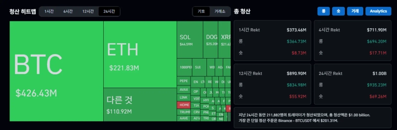 - 롱포지션 청산이 9억3500만달러로 압도적으로 많았으며, 바이낸스에서 가장 많은 청산이 발생했다고 전했다.