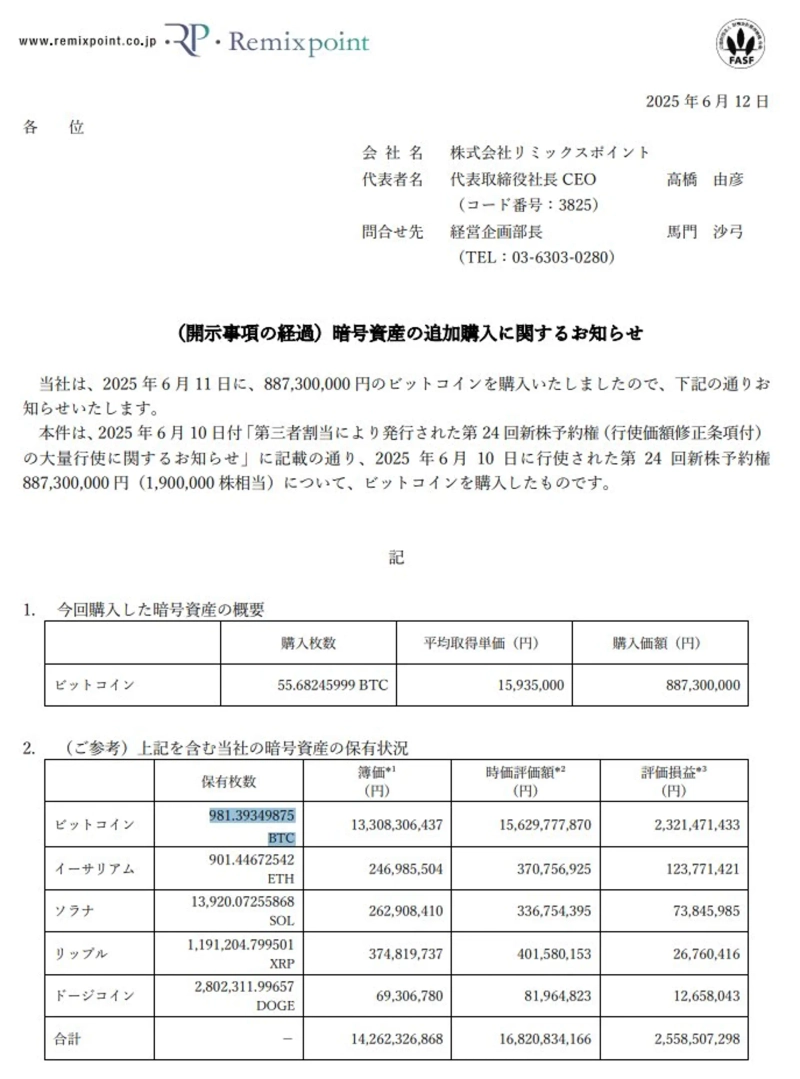 13일(현지시간) 리믹스 포인트는 공식 채널을 통해 "8억8730만엔에 55.68BTC를 매수했으며, 현재 보유 비트코인은 981.3934개다"라고 밝혔다.