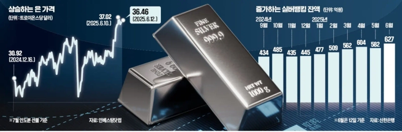금값 상승세가 다소 잦아든 사이 은(銀) 가격이 급등하며 주목받고 있다. 미국의 재정 악화 우려 등으로 안전자산 선호 심리가 강해지자 은에도 투자자금이 대거 유입되는 분위기다. 은 통장(실버뱅킹)과 상장지수펀드(ETF) 등 여러 관련 상품으로 자금이 밀려들고 있다. 전문가들은 은값이 더 오를 것으로 점치면서도 경기 변동에 따른 하락 가능성도 고려해야 한다고 했다. 투자에 붙는 세금과 수수료 등도 잘 따져봐야 한다고 조언했다.