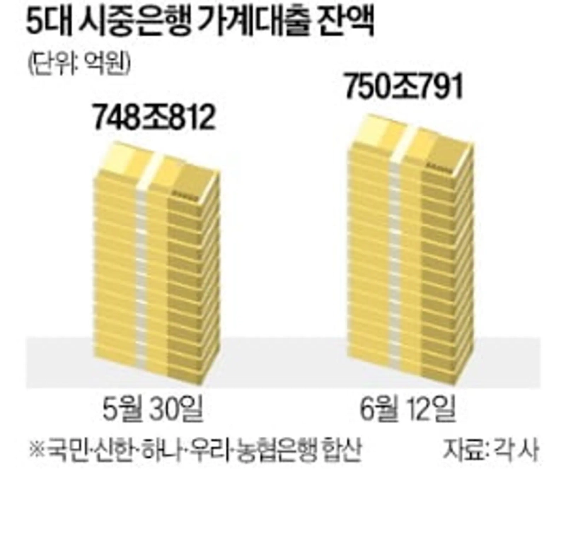 15일 금융권에 따르면 국내 5대 은행의 지난 12일 기준 가계대출 잔액은 750조791억원으로 지난달 말(748조812억원)보다 1조9979억원 증가했다. 이 같은 추세가 월말까지 유지되면 이달 가계대출 증가액은 5조원을 넘을 가능성이 높다. 5대 은행의 가계대출은 지난 4월(4조5337억원)과 5월(4조9964억원) 등 연이어 4조원 이상 불어났다.