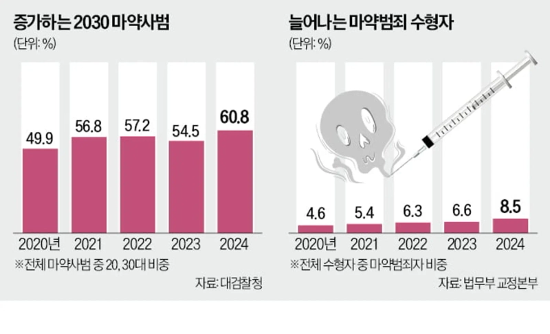 2030 청년들이 텔레그램, 다크웹 등 익명을 기반으로 한 '온라인 마약 유통망'에 급속히 유입되고 있다. 추적이 어려운 암호화폐와 익명 온라인 플랫폼을 통한 마약 범죄가 확산하면서 교정시설 내 마약사범 비중도 꾸준히 증가하고 있다.