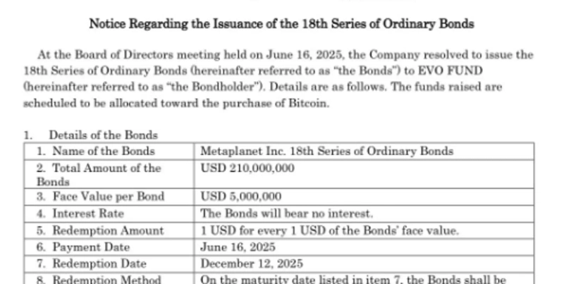 16일(현지시간) 메타플래닛은 엑스(구 트위터)를 통해 "비트코인 추가 매입을 위해 2억1000만달러 규모의 무이자 보통주 채권을 발행한다"고 알렸다.