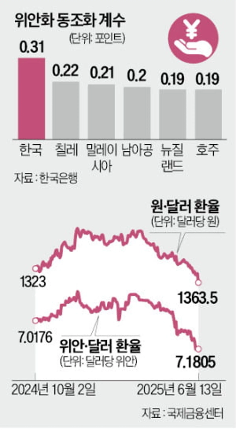 원화가 위안화와 같은 방향으로 움직이는 것은 양국의 경제 의존도가 높기 때문이다. 한국은 수출입 거래액의 약 20%가 중국과의 거래다. 중국 외환시장이 폐쇄적이라는 특성도 동조화 요인으로 거론된다. 위안화에 접근하기 어려운 투자자 중 일부가 중국에 투자하면서 원화로 환헤지하고 있어서다. 외환시장 관계자는 "글로벌 투자업계에선 원화를 위안화의 대리 통화로 여기는 투자자가 꽤 많다"고 말했다.