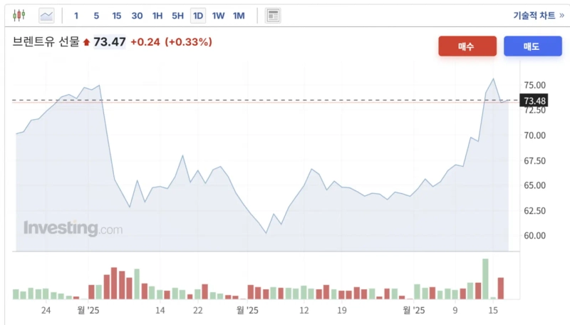 17일 국제 유가는 모두 장 초반 2% 이상 상승했다. 8월물 서부텍사스산 원유(WTI) 선물 가격은 전일 종가 대비 2.64% 상승한 배럴당 72.11달러까지 올랐고 글로벌 벤치마크인 브렌트유 선물 가격은 2.21% 오른 74.85달러(장중)를 기록했다. 이스라엘이 이란을 전격 공습한 지난 13일 WTI와 브렌트유는 7% 급등한 가격에 마감했다가 다음 거래일인 16일에는 이란이 갈등 완화를 모색하고 있다는 신호가 포착되면서 하락 마감했다.