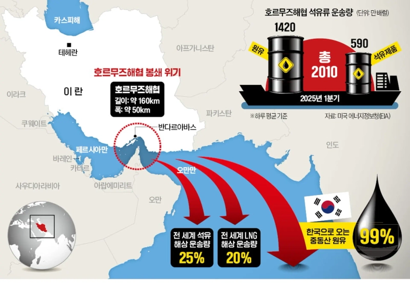 - 호르무즈해협은 세계 원유 수송량의 20%가 통과하는 주요 병목 지점으로, 봉쇄 시 글로벌 에너지 공급에 충격이 예상된다고 밝혔다.