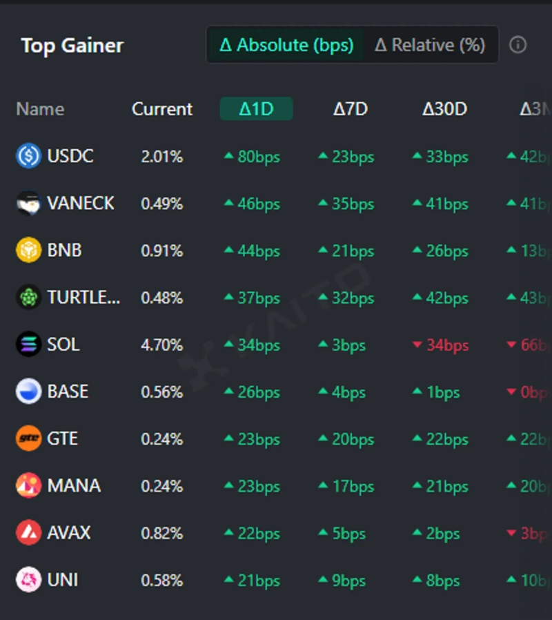 - 카이토의 토큰 마인드셰어에 따르면 USDC, 반에크, 바이낸스코인(BNB), 터틀클럽(TURTLECLUB), 솔라나(SOL) 등이 투자자들의 관심 키워드 상위 5개로 집계됐다고 전했다.