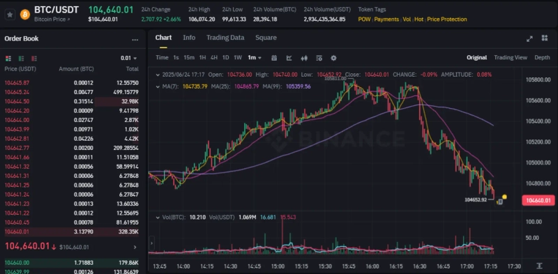 휴전 소식에 상승세를 보이던 비트코인(BTC)도 상승폭을 일부 반납했다. 오후 5시 18분 현재 바이낸스 USDT마켓 기준 비트코인은 24시간 전 대비 2.46% 상승한 10만4640달러에 거래되고 있다.