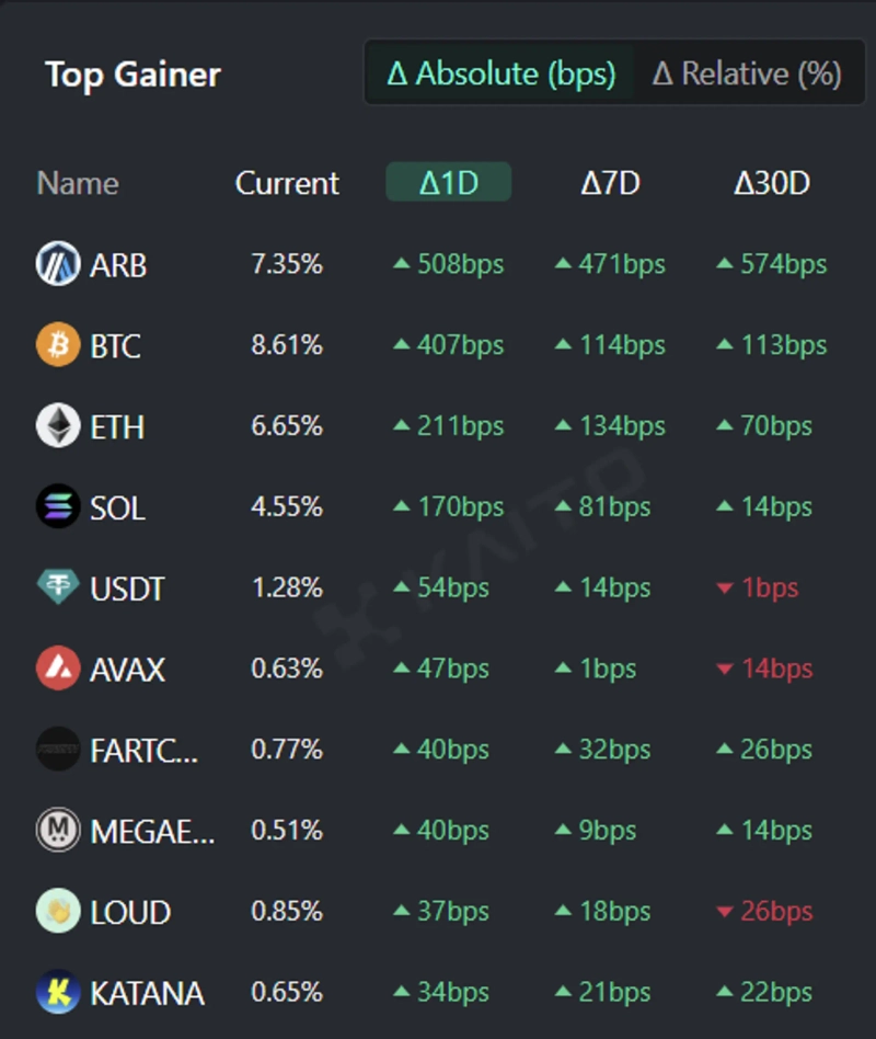 - 카이토가 발표한 아비트럼, 비트코인, 이더리움, 솔라나, 테더가 최근 투자자들의 높은 관심을 받고 있다고 전했다.