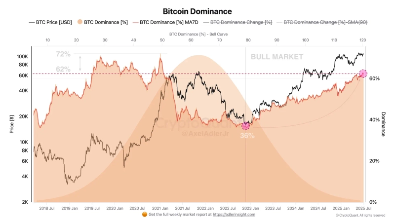 2일(현지시각) 악셀 애들러 주니어(Axel Adler Jr) 크립토퀀트 기고자는 X(옛 트위터)를 통해 "지난 6월 비트코인 도미넌스는 1% 추가 상승하며, 이번 사이클 최고치를 경신했다"라며 "기관들의 핵심 자산은 여전히 비트코인"이라고 밝혔다.