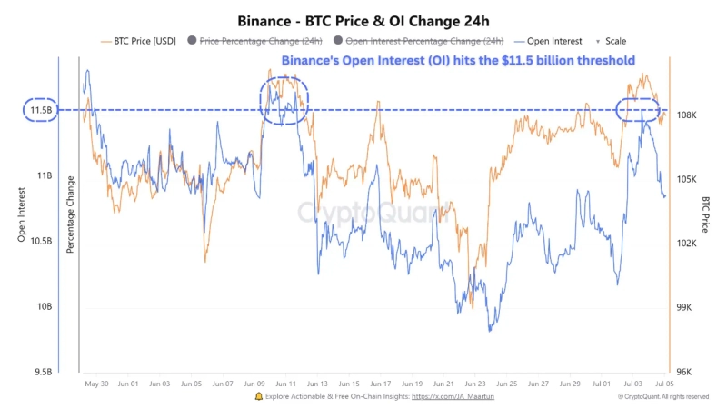 이날 퀵테이크에 따르면 바이낸스 비트코인 선물 미결제약정(Open Interest·OI)은 최근 115억달러 부근까지 상승한 이후 감소세를 보이고 있다. 분석가는 "선물 포지션이 해당 저항 구간을 반복적으로 돌파하지 못하고 청산되는 모습은 단기적 상승세의 소진을 시사한다"라고 설명했다.