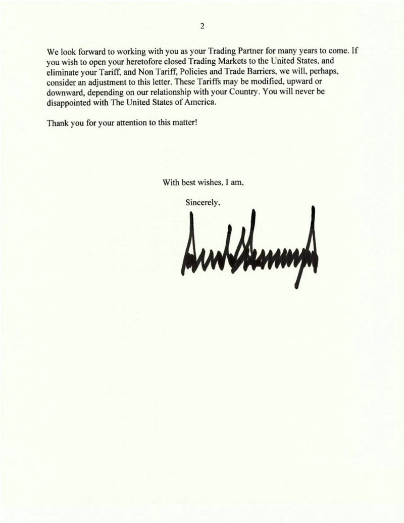 트럼프 대통령이 보낸 문서는 한국과 일본의 수신인만 다르고 나머지는 모두 동일한 내용으로 구성돼 있다. 복사 후 붙여넣기 식으로 작성된 것이다. 트럼프 대통령은 한국에 보낸 편지에서 "불행하게도 우리의 무역관계는 상호주의와는 거리가 멀었다"면서 "한국의 관세 및 비관세, 정책, 무역장벽으로 인해 오랜 기간 지속되어 온 무역적자를 해소하기 위해 이제는 방향을 전환해야 한다는 결론을 내렸다"고 했다.