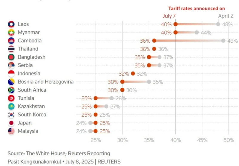 9일 외신에 따르면 트럼프 대통령이 7일(현지시간) 14개국에 25∼40%의 국가별 상호관세를 적시한 '관세 서한'을 보내고, 이를 8월 1일부터 부과하겠다고 통보했다. 트럼프 대통령은 이날 무역 상대국들에 대한 상호관세 부과 유예 시한을 기존의 7월 9일에서 8월 1일까지로 연장하는 행정명령에도 서명했다. 주로 한국과 일본 등이 주목받았지만 다른 국가 관세도 눈여겨 봐야 한다는 지적이 나온다.