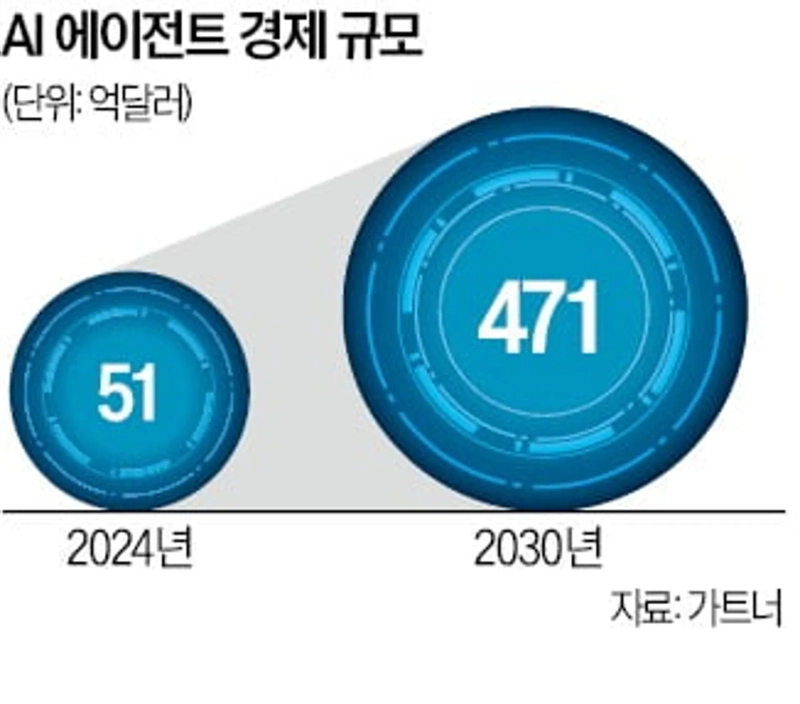 15일 시장조사업체 가트너에 따르면 지난해 글로벌 AI 에이전트 시장 규모는 51억달러였다. AI 에이전트는 AI가 사람처럼 목표를 이해하고 스스로 판단해 작업을 수행하는 소프트웨어 프로그램이다. 이 시장은 2030년 471억달러로 9배 이상 커질 것으로 전망된다.