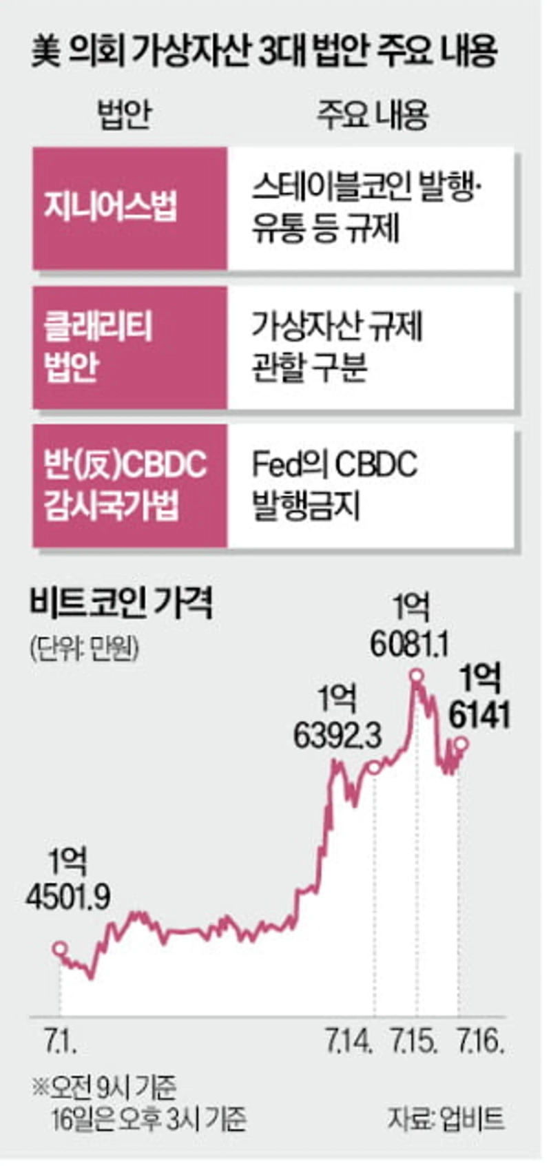 미 하원은 이번 주를 크립토위크(가상자산 주간)로 지정하고 지니어스법과 가상자산 규제 관할권을 명확히 하는 클래리티법, 미 중앙은행(Fed)의 중앙은행디지털화폐(CBDC) 발행을 금지하는 반(反)CBDC법 등 3개 법안 통과를 추진했다.