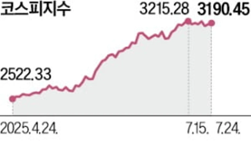 24일 코스피지수는 0.21% 상승한 3190.45에 거래를 마쳤다. 개장 직후 코스피지수는 3237.97까지 오르며 지난 22일 기록한 연중 최고점(3220.27)을 넘겼다. 개장 전 SK하이닉스 등 대형주가 탄탄한 2분기 실적을 공시하고, 한·미 관세 협상이 일본처럼 우려한 것보다 좋은 결과를 도출할 수 있을 것이란 기대가 지수를 끌어올렸다.