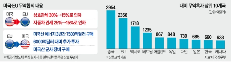 국내총생산(GDP) 기준 세계 1, 2위 경제권인 미국과 유럽연합(EU)이 관세협상 종료 시한을 닷새 앞두고 무역협정을 타결하면서 세계 경제의 불확실성이 상당 부분 걷히게 됐다. EU는 1조3500억달러 규모의 미국산 에너지 구매 및 대미 투자를 약속하고 관세 인하를 끌어냈다. 하지만 반도체와 의약품 관세에 대해선 양측 간 해석 차이가 있어 갈등의 불씨가 남아 있다는 지적이 나온다.