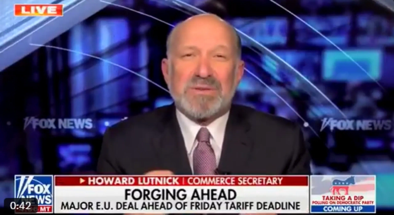 러트닉 장관은 전날 스코틀랜드 턴베리에서 열린 트럼프 대통령과 우르줄라 폰데어라이엔 유럽연합(EU) 집행위원장의 회동 장소에 배석했다. 다만 이날 트럼프 대통령과 키어 스타머 영국 총리의 정상회담에는 참석하지 않았다.