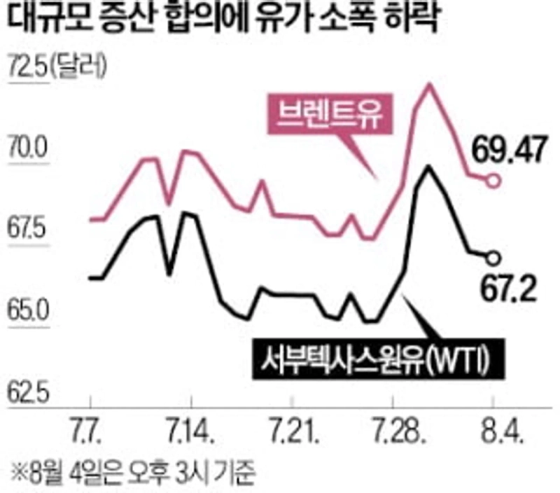 OPEC+, 감산 접고 2년 만에 원유 증산OPEC+는 오는 9월부터 하루 원유 생산량을 54만7000배럴 늘리기로 합의했다고 3일(현지시간) 밝혔다. 이날 OPEC+는 성명을 통해 "세계 경제가 안정적이고, 석유 재고량이 적은 점을 고려해 생산량을 조정하기로 결정했다"고 설명했다. 기존에 승인된 아랍에미리트(UAE)의 30만배럴 규모 추가 증산도 포함됐다.