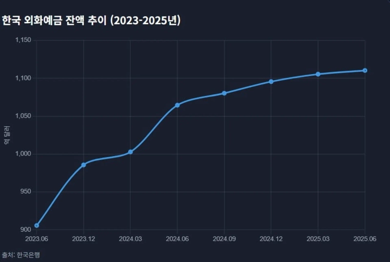 한국의 경우에도 외화 예금이 증가하고 있다. 한국은행에 따르면 올 6월 말 기준 국내 거주자 외화예금 잔액은 1064.4억 달러로 전월 대비 50.8억 달러 늘었다. 두 달 연속 증가세다. 1년 전(905.7억 달러)과 비교하면 약 17.5% 증가한 수치다.