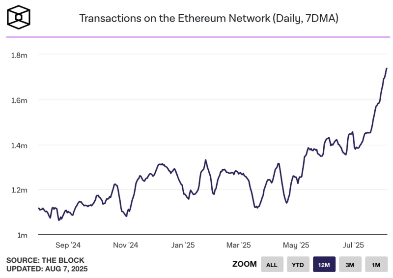 - 이더리움(ETH) 일일 트랜잭션 수가 174만건으로 4년 만에 최고치를 경신했다고 더블록이 전했다.