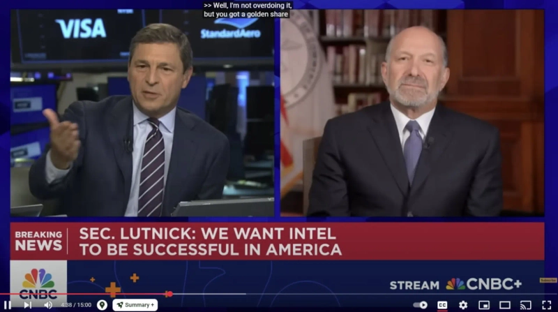 이런 지분이 경영권이나 거버넌스를 갖게 되는 의미냐는 질문에 대해서는 "그런 부분이 아니다"고 말했다. 그는 "단순히 바이든 정부의 지원금을 트럼프 정부의 지분투자로 바꾸는 것 뿐"이라고 주장했다. 진행자가 "10% 지분을 갖게 되면 투표권 같은 거버넌스가 따라오느냐"고 다시 묻자 러트닉 장관은 짜증스럽게 "그건 고려하지 않는다"면서 "초점이 아니다"고 했다. US스틸에 대해 황금주를 요구했던 사실을 진행자가 상기시키자 러트닉 장관은 "일본제철이 US스틸을 인수할 때 그들이 한 12개 약속을 지키도록 하기 위한 것"이라고 설명했다.