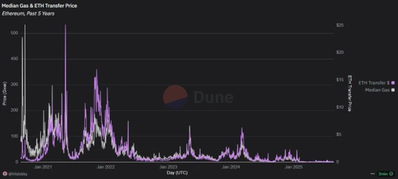 이더리움(ETH)이 최근 사상 최고가를 경신한 가운데, 네트워크 이용 수수료인 가스비는 오히려 저점 수준을 유지하고 있는 것으로 나타났다.