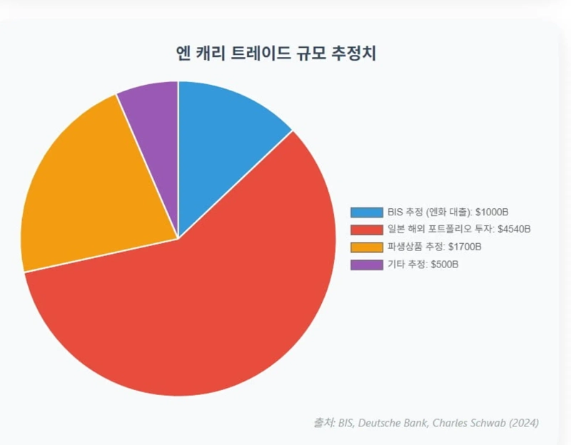 해당 거래의 정확한 규모를 파악하는 건 어렵다. 하지만 국제결제은행(BIS)에 따르면 일본 내 은행에서 발생하여 해외로 나간 엔화 표시 대출 규모는 2024년 3월 기준 약 157조 엔에 달했다. 이는 약 1조 달러에 해당하는 금액이다. 이는 자산운용사 등 중장기 투자자들이 활용하는 자금이다. 단기 투기성 선물 포지션이나 파악이 어려운 장외 파생상품 시장의 자금을 제외한 보수적인 추정치다. 1조 달러가 넘는 자금이 전 세계 주식, 채권, 원자재, 신흥국 시장으로 흘러 들어가며 글로벌 자산 가격을 부양하는 숨은 유동성 공급원 역할을 해왔다.