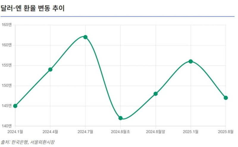 최근에도 엔화는 강세 압력을 받고 있다. 8월 22일 파월 의장의 잭슨홀 연설 직전 달러·엔 환율이 1달러당 148.0엔까지 올랐다. 파월 의장의 비둘기파적 언급 후 달러 약세로 146엔대로 급락하는 등 변동성이 커졌다. 엔화 가치 상승은 캐리 트레이드 투자자에게 이중 손실을 안긴다. 투자자는 해외 자산을 매도해 달러를 엔으로 환전해 빚을 갚아야 한다. 엔화 가치가 뛰면 빚 상환 부담이 증가한다.