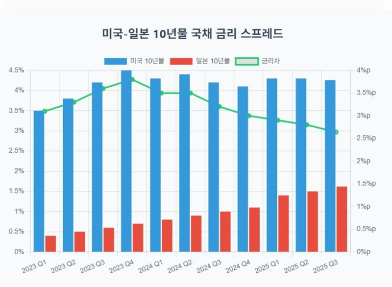 최근 10년물 국채 금리는 미국은 4.30% 내외, 일본 1.6% 내외로 격차가 2.7% 포인트까지 줄었다. 1년 전에는 그 차이가 3% 포인트가 넘었다. 금리차 축소는 엔화 조달 매력 감소를 뜻한다. 엔화 단기 차입 비용(이자)이 올라가고 달러 등 투자 대상의 금리가 내려오면, 캐리 트레이드로 얻는 이자 이익이 줄어든다.