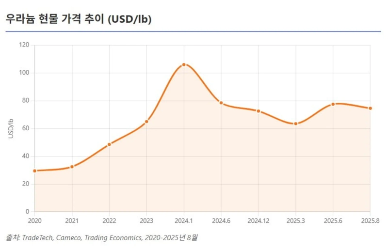 가격 급등의 배경은 공급 차질과 수요 확대 요인이 복합적으로 작용했다. 세계 최대 생산국 카자흐스탄은 2024년~2025년 증산 계획이 황산 부족 등으로 차질을 빚으며 줄였다. 니제르의 불안정으로 일부 공급에 공백 가능성도 생겼다. 여기에 러시아발 제재 리스크로 많은 우라늄 구매자들이 시장 비축과 장기 계약 확보에 나서 수요 측 압력이 커졌다. 우라늄 가격은 2020년대 초까지만 해도 20~30달러대였지만 2022년 러-우 전쟁 이후 1~2년 새 두 배 이상 급등했다.