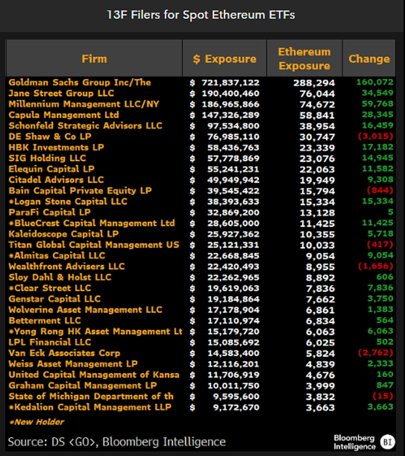 - 골드만삭스가 이더리움 현물 ETF를 약 7억2100만달러 규모로 보유한 것으로 나타났다.