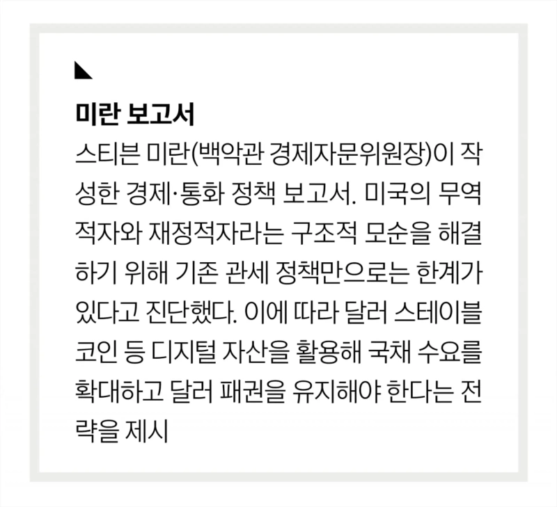 - 미국의 스테이블코인 정책 확대와 디지털 자산 논의는 달러 패권 유지 및 국채 수요 보완에 전략적 의미가 있다고 전했다.