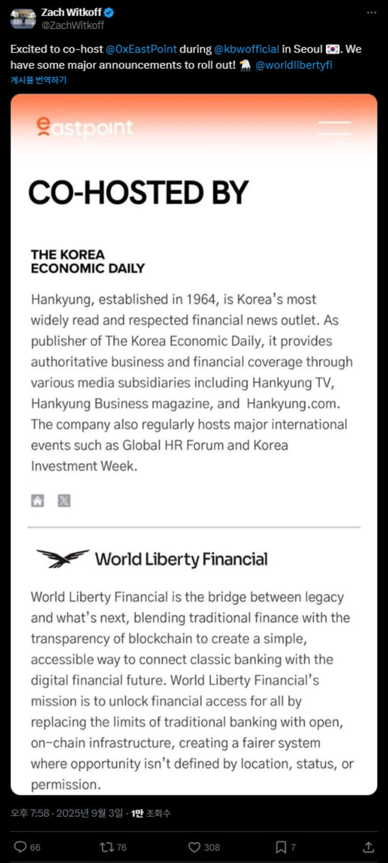 도널드 트럼프 미국 대통령 일가 및 최측근이 주도해 설립한 디지털자산(암호화폐) 금융 기업 월드리버티파이낸셜(WLFI)의 잭 위트코프(Zach Witkoff) 최고경영자(CEO)가 오는 9월 22일 서울에서 개최되는 이스트포인트:서울 2025(EastPoint:Seoul 2025, 이하 이스트포인트)에서 중대 발표가 있을 것임을 시사했다.