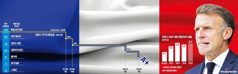 재정 적자 우려가 커지자 국제 신용평가사들이 최근 프랑스 신용등급을 잇달아 내리고 있다. 지난해 말 프랑스 정부가 2025년 예산안을 발표한 당시 피치는 프랑스의 국가 전망을 '부정적'으로 평가했다. 부정적 전망을 제시한 지 1년도 되지 않아 강등 결정을 내린 것이다. 지난해 초 S&P도 프랑스 신용등급을 'AA-'로 낮췄다. S&P는 프랑스 정부가 재정 적자를 줄이지 못하면 오는 11월 평가에서도 등급을 하향 조정할 수 있다고 발표했다.