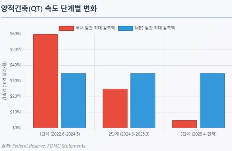 2단계(2024년 6월~2025년 3월)에서는 속도를 처음 줄였다. 국채를 줄이는 규모를 매달 최대 250억 달러 수준으로 크게 낮췄다. 3단계(2025년 4월~현재)는 긴축 속도를 두 번째로 더 크게 낮춰 매달 국채를 최대 50억 달러씩만 줄이고 있다. 지금은 시장이 충격을 덜 받도록 '초저속 QT'를 유지하고 있는 단계라는 분석이다.