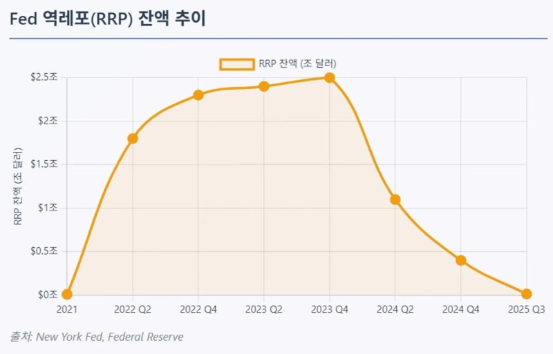 쉽게 말해 시중에 너무 많은 돈이 풀려 있을 때 Fed가 일부를 잠시 회수해 금융 시스템의 안정성을 유지해 왔다. 특히 Fed가 자금을 줄여나가는 양적긴축(QT) 상황에서 시장에 갑작스러운 충격이 생기지 않도록 자금 흐름을 조절하는 '완충재' 역할을 해왔다.