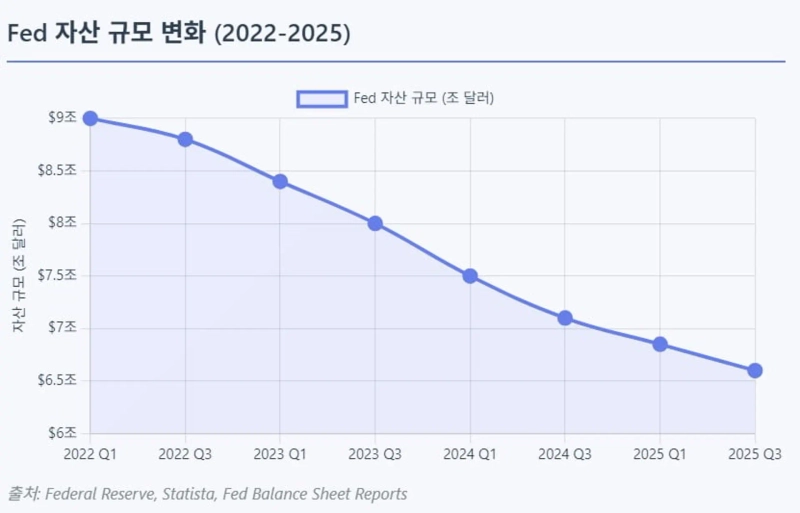 Fed가 양적긴축(QT)을 하는 방식은 이렇다. Fed가 보유한 국채가 만기가 되어 돌아오면, 다시 투자하지 않고 그대로 둬 시장에서 자연스럽게 돈을 회수하는 방식(런오프 방식)을 쓴다. 이 과정을 통해 Fed가 보유한 전체 자산은 2022년 약 9조 달러에서 현재 약 6조 6000억 달러 수준으로 줄었다. 약 2조 4000억 달러의 자금이 이미 회수된 것이다.