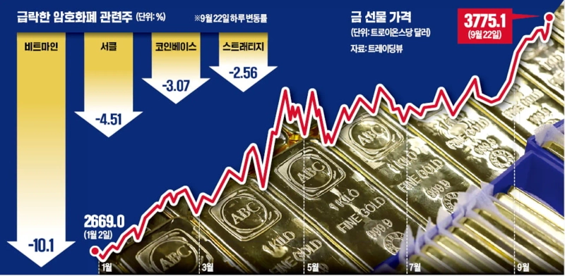 국제 금값이 연일 사상 최고치를 경신하자 글로벌 자금이 암호화폐에서 금으로 대거 이동하고 있다는 관측도 나온다. 도널드 트럼프 미국 행정부의 불확실한 관세정책 속에서 투자자의 안전 자산 선호 현상이 뚜렷해진 가운데, 미국 중앙은행(Fed)이 연말까지 기준금리를 추가로 인하할 것이라는 기대가 금값을 밀어올리고 있다.