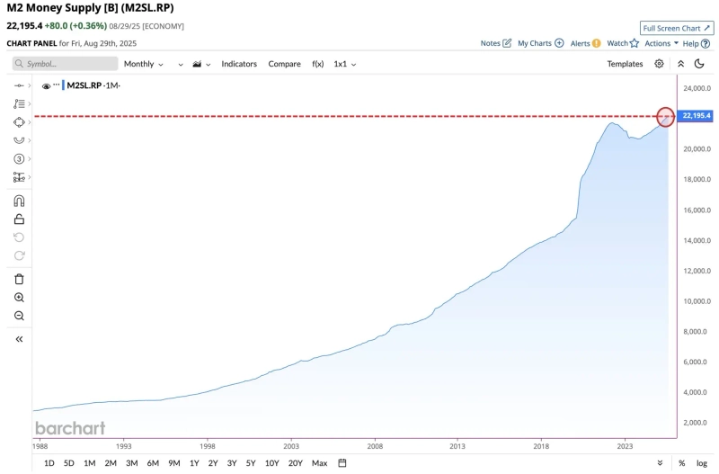 24일(현지시각) 코인텔레그래프는 X(옛 트위터)를 통해 "미국 M2 통화 공급량이 22조2000억 달러를 기록했다"라며 "이는 사상 최대치"라고 밝혔다.