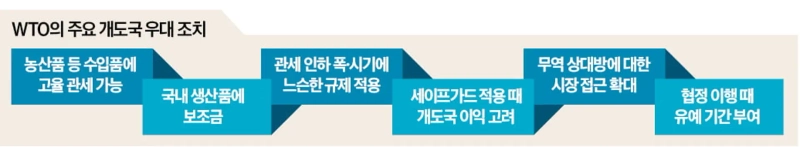 WTO는 개도국에 규범 이행 유예와 무역 자유화 의무 완화, 기술·재정 지원, 농업 보호 등 각종 특혜(SDT)를 제공하고 있다. 개도국이 누릴 수 있는 혜택만 150여 개에 달한다. 하지만 개도국 지위에 관한 공식 기준은 없다. 가입국 스스로 개도국 지위를 선언하거나 포기할 수 있는 구조다.