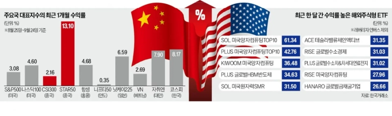 최근 1개월간 중국과 미국 대표지수에 투자하는 상장지수펀드(ETF)가 높은 수익을 거둔 것으로 나타났다. 이들 증시를 주도하는 인공지능(AI) 기술주가 랠리를 펼친 덕분이다. 반면 신흥국 ETF는 주춤했다. 특히 미국 관세에 이어 'H-1B' 전문직 비자 문제로 타격을 받은 인도가 마이너스 수익률을 기록했다.