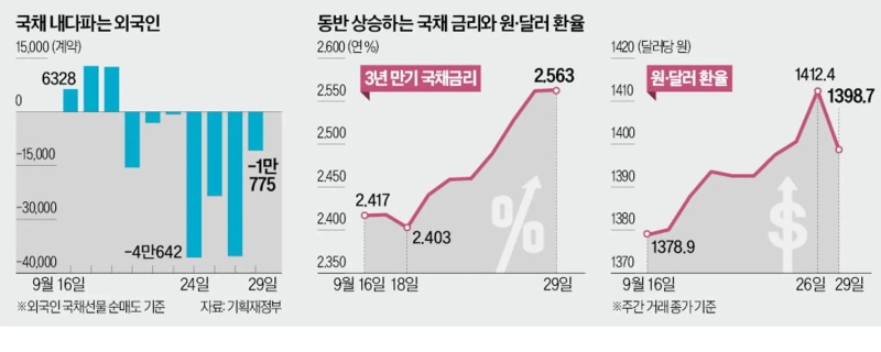 최근 원·달러 환율이 1400원을 돌파한 후 환손실을 우려한 외국인이 국채 매도량을 늘렸다는 분석도 나온다. 고환율은 국내 주식시장이 최근 조정받은 주요 원인으로도 거론된다. 안동현 서울대 경제학부 교수는 "외국인은 금리뿐 아니라 환이익도 염두에 두고 국채에 투자한다"며 "최근 커지는 환율 변동성에 따라 외국인이 투자 물량을 줄인 것으로 보인다"고 설명했다.