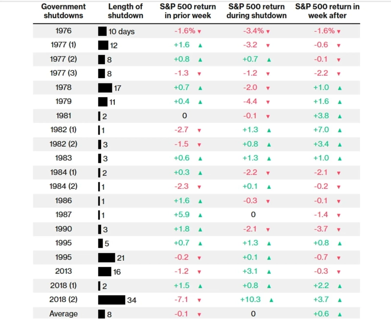 미국 시장은 과거 셧다운 사태를 바탕으로 기대치를 설정해왔다. 블룸버그가 인용한 트루이스트 증권이 집계한 자료에 따르면, 지난 50년간 20번에 걸친 미국 연방 정부의 폐쇄 기간중 S&P 500 지수는 평균적으로 특별히 오르지도 하락하지도 않았다. 대부분의 셧다운이 정치적 갈등을 길게 끌지 않고 경제적 피해는 피하도록 백악관과 의회가 단시일내 해결해왔다.