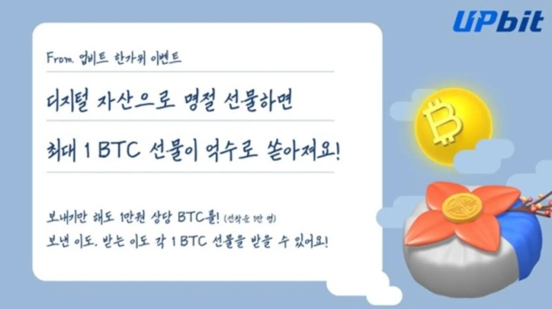 - 업비트는 추석을 맞아 총 4억원 규모의 비트코인을 지급하는 디지털 자산 선물 이벤트를 진행한다고 전했다.
