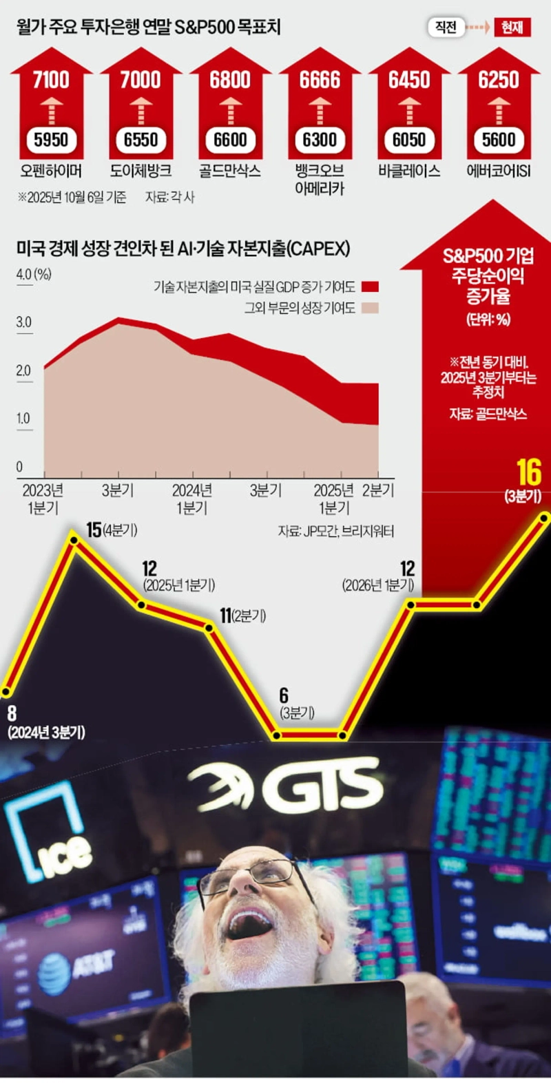 관세 불확실성과 7년 만에 재연된 미국 연방정부 셧다운(일시적 업무 정지), 가라앉지 않는 기술주 거품 논쟁까지. 산적한 과제에도 월가 투자은행들이 증시 강세론을 쏟아내는 배경엔 인공지능(AI)이 호황을 이끌 것이라는 낙관이 깔려 있다. 최근 미국 S&P500지수가 내년 말 9000까지 치솟을 수 있다고 전망해 주목받은 줄리언 이매뉴얼 에버코어ISI 수석 주식·퀀트 전략가는 "지금은 (30년 전) 인터넷 혁명처럼 또 다른 AI 혁명 랠리가 펼쳐지고 있다"며 "기술 혁명이 주가와 사회 전반의 성장률을 사상 최고 수준으로 끌어올리고 있다"고 했다.