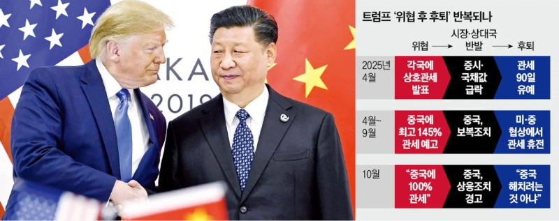 트럼프 대통령은 중국이 지난 9일 희토류 수출 통제를 강화하자 하루 만에 "11월 1일부터 중국산 제품에 100% 관세를 매기겠다"고 으름장을 놨다. 이에 중국은 "싸움을 바라지 않지만 두려워하지도 않는다"며 "미국이 고집을 부린다면 상응 조치를 취하겠다"고 맞섰다. 이에 따라 미·중 관세 휴전이 깨지는 것 아니냐는 관측이 나왔다.