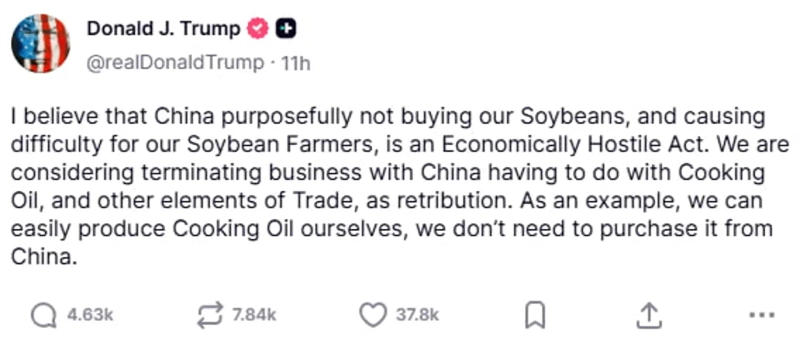 트럼프 대통령은 이날 SNS에 올린 글에서 "중국이 의도적으로 우리의 대두를 사지 않고 우리의 대두 농가에 어려움을 초래한다고 믿는다"면서 "이에 대한 보복으로서 중국과 식용유 거래를 중단하고 다른 무역 조치도 고려하고 있다"고 적었다. 이어 "우리는 쉽게 식용유를 자체 생산할 수 있다. 중국에서 살 필요는 없다"고 덧붙였다.