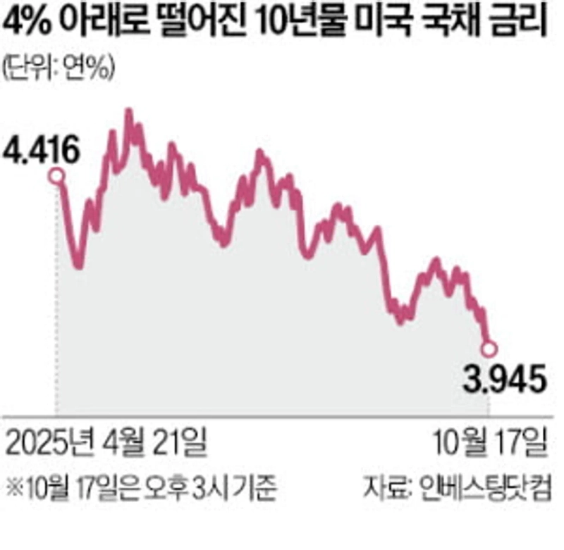 17일 금융정보 사이트 인베스팅닷컴에 따르면 이날 오후 3시 기준 10년 만기 미 국채 금리는 연 3.945%를 기록했다. 전날보다 0.81% 떨어졌다. 미국이 상호관세를 발표한 지난 4월 연 4.5%대까지 올랐던 금리가 4% 밑으로 떨어진 것이다. 연중 최저 수준이다.
