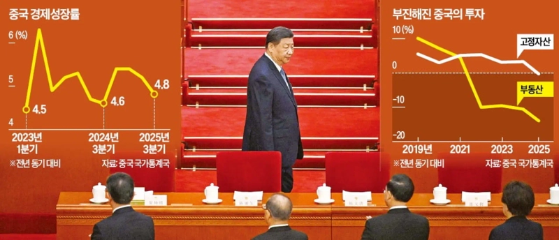 중국 경제에 '적신호'가 켜졌지만 일단 정부는 내수 진작보다 첨단기술 투자에 경제정책의 무게중심을 둘 방침이다. 중국 공산당은 이날부터 오는 23일까지 4중전회에서 5년간의 '경제 청사진'을 제시하는 제15차 5개년 계획(2026∼2030년)을 논의한다. 미·중 무역 전쟁, 내수 부진, 부동산 침체 등으로 내우외환인 상황이지만 이번 5개년 계획에서 첨단 제조업 경쟁력 강화를 위한 기술 자립을 우선순위에 놓고 첨단산업 부문의 인프라 투자 확대를 집중적으로 다룰 것으로 보인다.