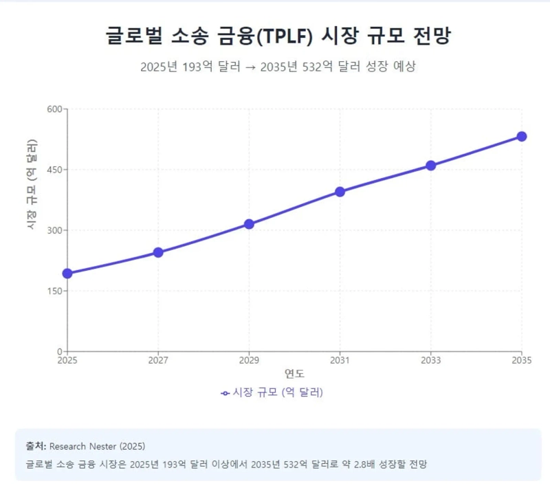22일 미국 시장조사업체 '리서치 네스터'에 따르면 글로벌 소송 금융 시장 규모는 올해 193억 달러 이상에서 오는 2035년에는 532억달러에 이를 전망이다. 미국의 위기관린 전문 컨설팅업체 '마라톤 스트래터지즈'에 따르면 지난해 미국에서 1000만 달러 이상 배상 평결인 이른바 '핵폭탄급 평결'은 135건 발생했다고 분석했다. 관련 총 소송액은 313억 달러에 달했다. 전년 대비 52% 증가한 사상 최고치다.